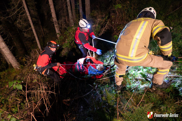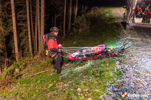 Während die Bergrettung die Versorgung und Rettung des unter dem Baum eingeklemmten Forstarbeiters übernahm, befreite die Feuerwehr Gerlos die beiden Insassen des abgestürzten Fahrzeugs mithilfe