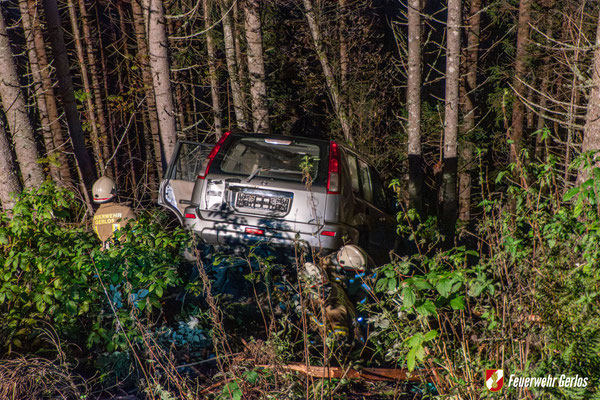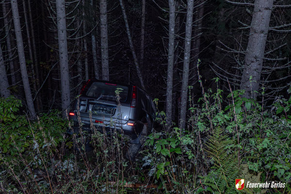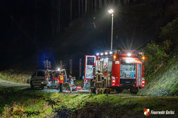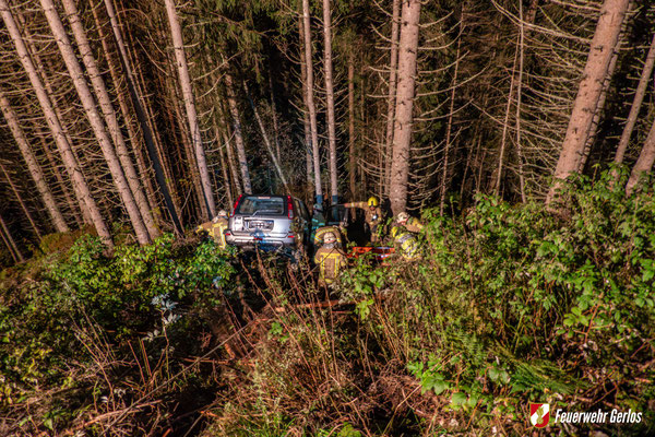 Ein Fahrzeug war einen Hang hinabgestürzt, darin befanden sich zwei schwer verletzte und eingeklemmte Personen. Das Fahrzeug drohte weiter abzurutschen. Zeitgleich wurde eine weitere Person unter